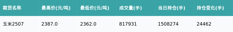 南财智讯5月7日电宏琳优配,南财金融终端盘后期货数据显示,大连商品交易所的玉米主力合约收涨0.25%,收盘报2369.0元/吨,日内资金流出6.12亿元。其他相关指标见下表:
